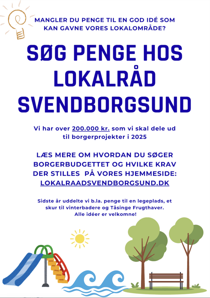 SØG PENGE HOS LOKALRÅD SVENDBORGSUND! Vi har officielt åbent vores pulje for indsendelse af projekter som vil søge borgerbudgetter i 2025. Lokalråd Svendborgsund har over 200.000 kr. som skal deles ud til lokaleildsjæle med hovedet fuld af gode idéer. Der er få krav til dit projekt, vigtigst er det at det bringer glæde til så mange […]